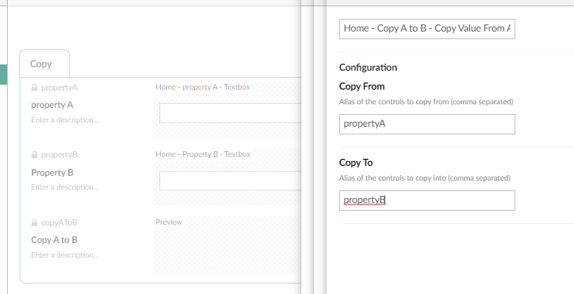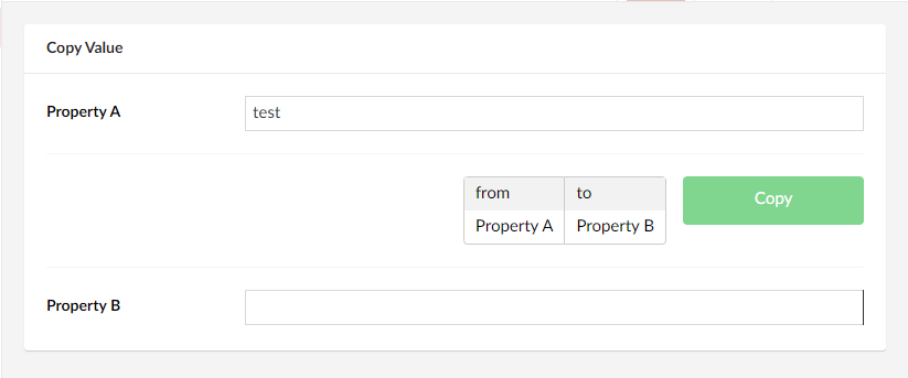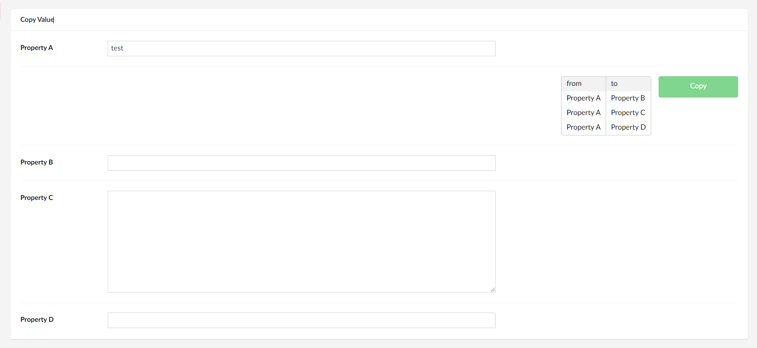 - Creates a button that copies values from one (or several) property into another. The values are copied following the same index of the string array.