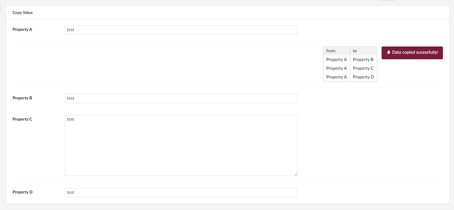 This Property Editor is a simple copy button that copies one or many values from a property into another property. Useful when you have more than one property with the same purpose, but that may or may not be the same value. Minimizes duplication of work. Ex. When you want an article title to replicate the meta title.