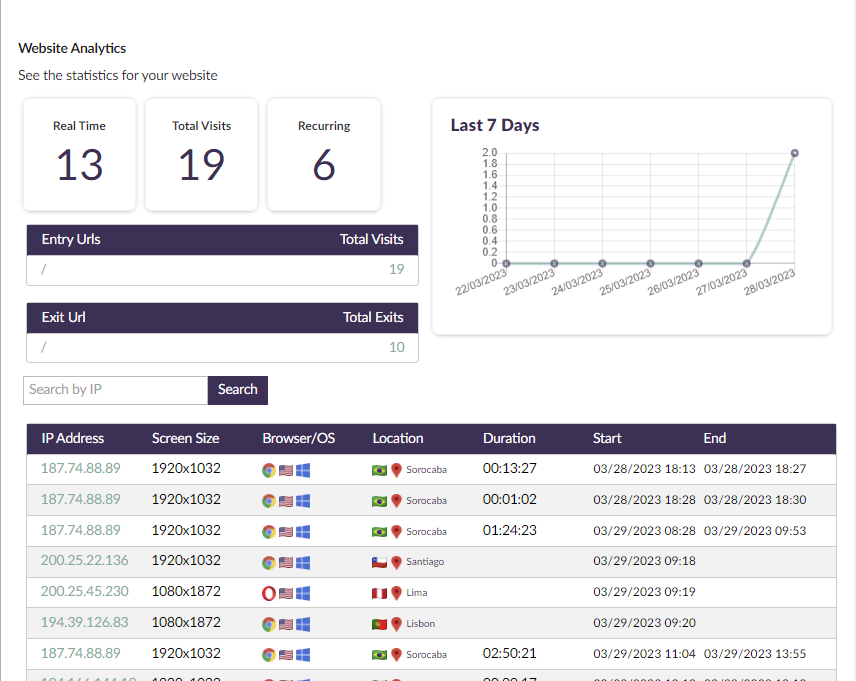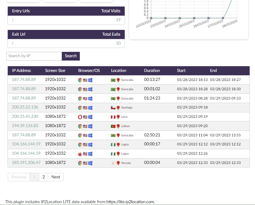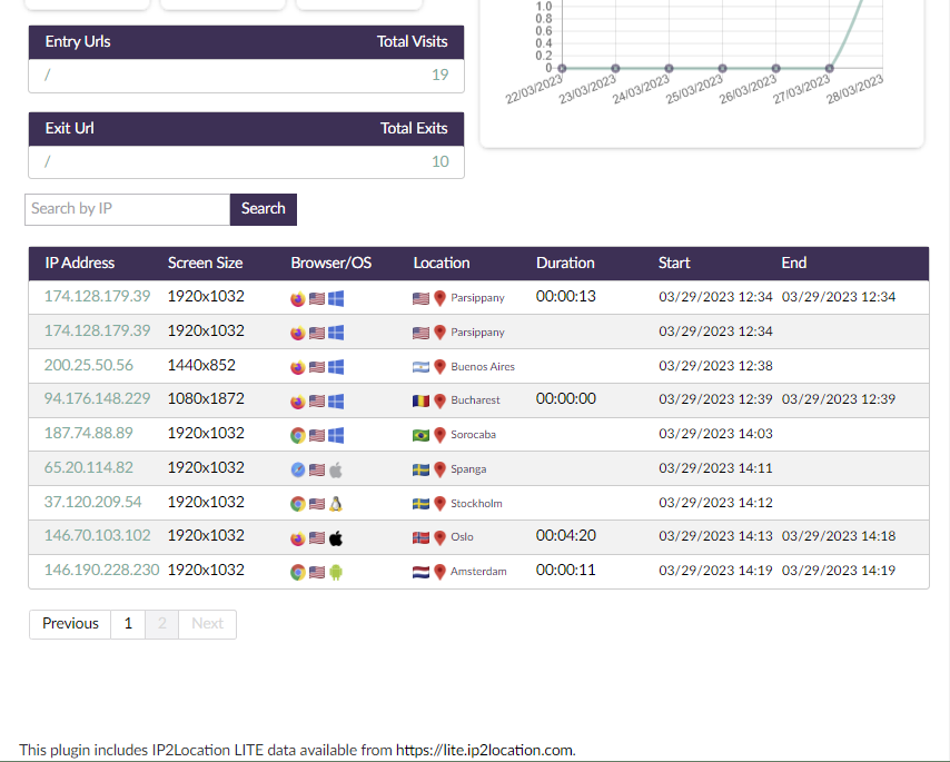 - Displays Browser User Agent, Location, IP, and Duration of Visits.